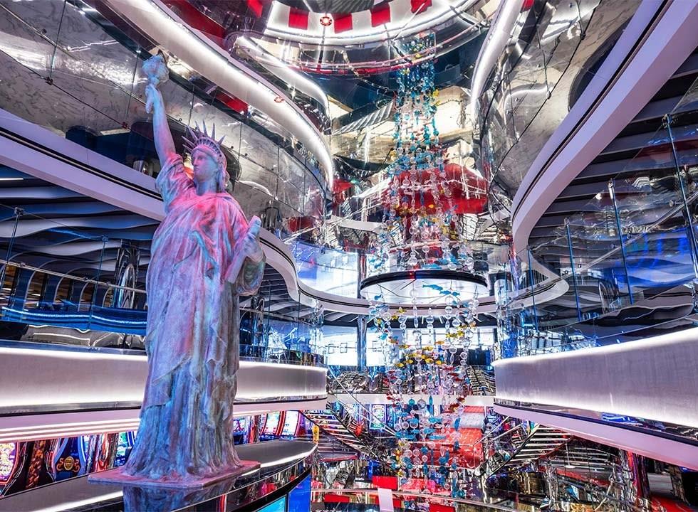 MSC Seashore pays tribute to New York City, a destination that represents the spirit of discovery and cultural experiences that is at the heart of the MSC Cruises guest experience. Venue names, public areas, and design features are inspired by the world-famous city, such as a 9.5-foot replica of the Statue of Liberty at the heart of the casino and an expansive retail and entertainment area aptly named Times Square. Here, an impressive 27.5-foot LED wall spans four decks and features a projection of the iconic Manhattan skyline that can change from day to night.